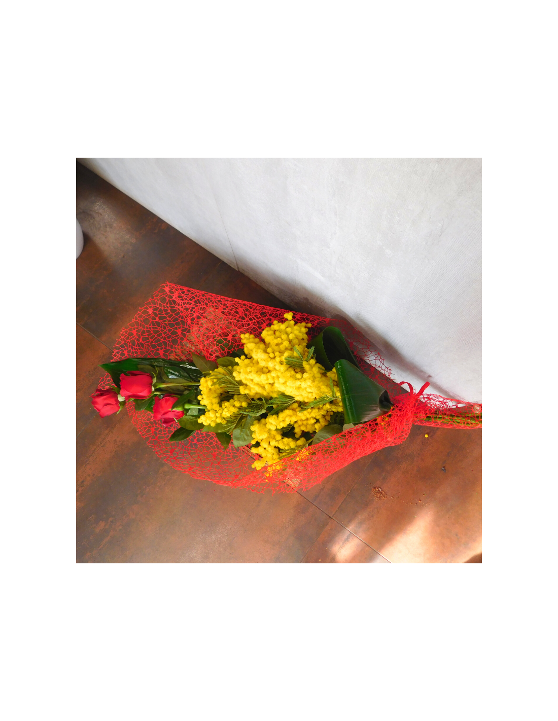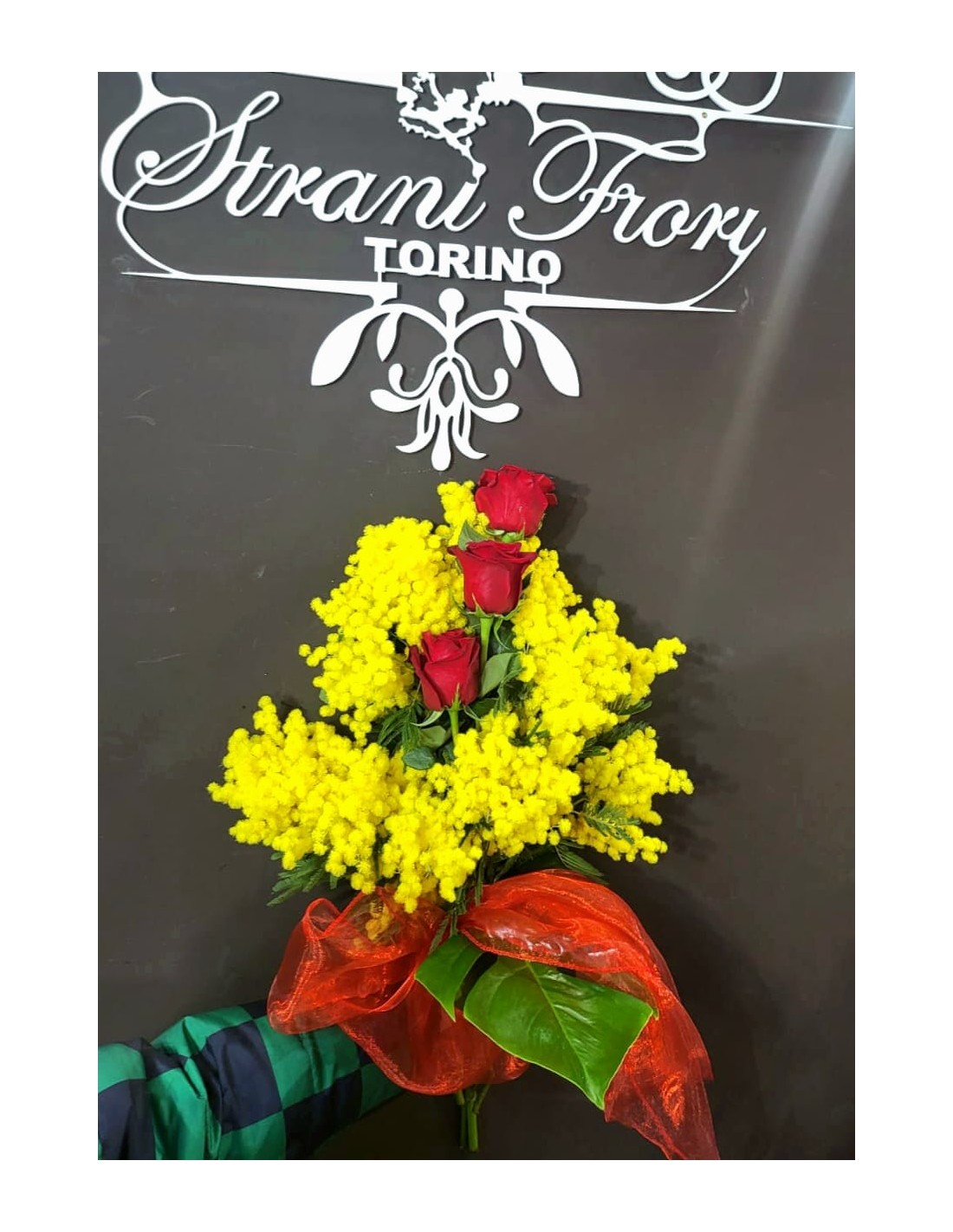 Stupisci le tue donne con un mazzo di rose rosse con mimosa e foglie di aspidistra: sii originale per la Festa della Donna!