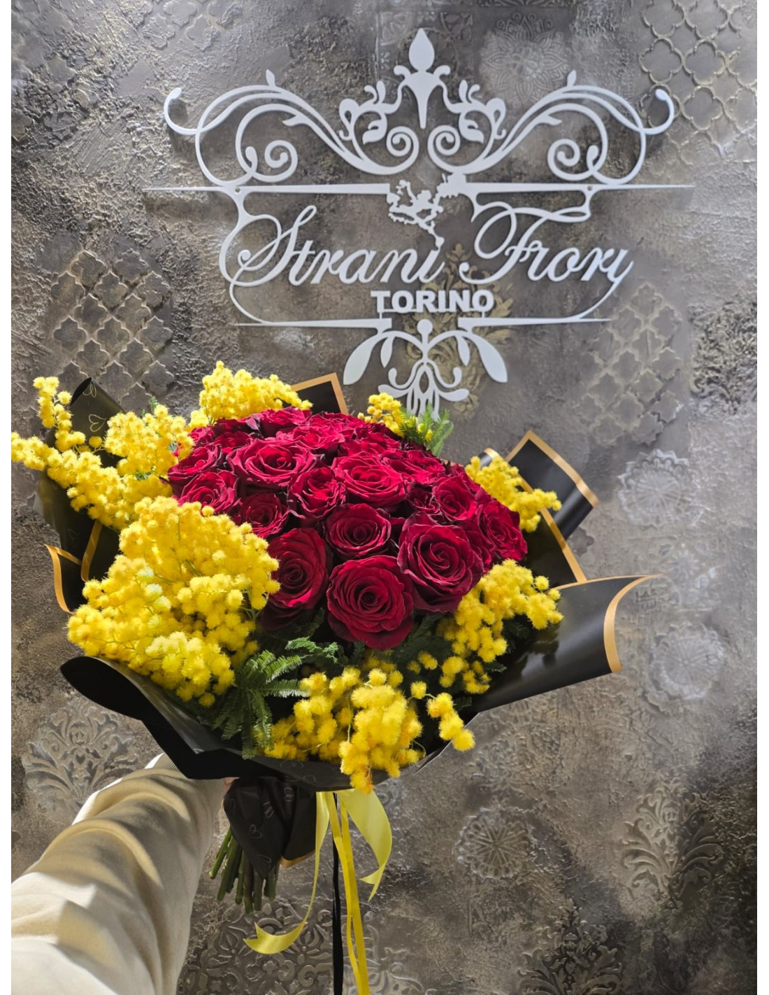 19 bellissime rose con mimosa intorno e carta nera super moderna...