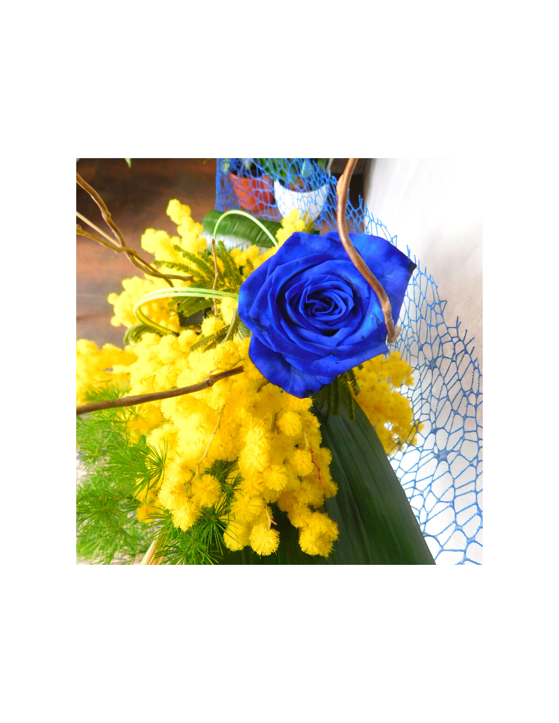 Bouquet di mimose e rosa blu
