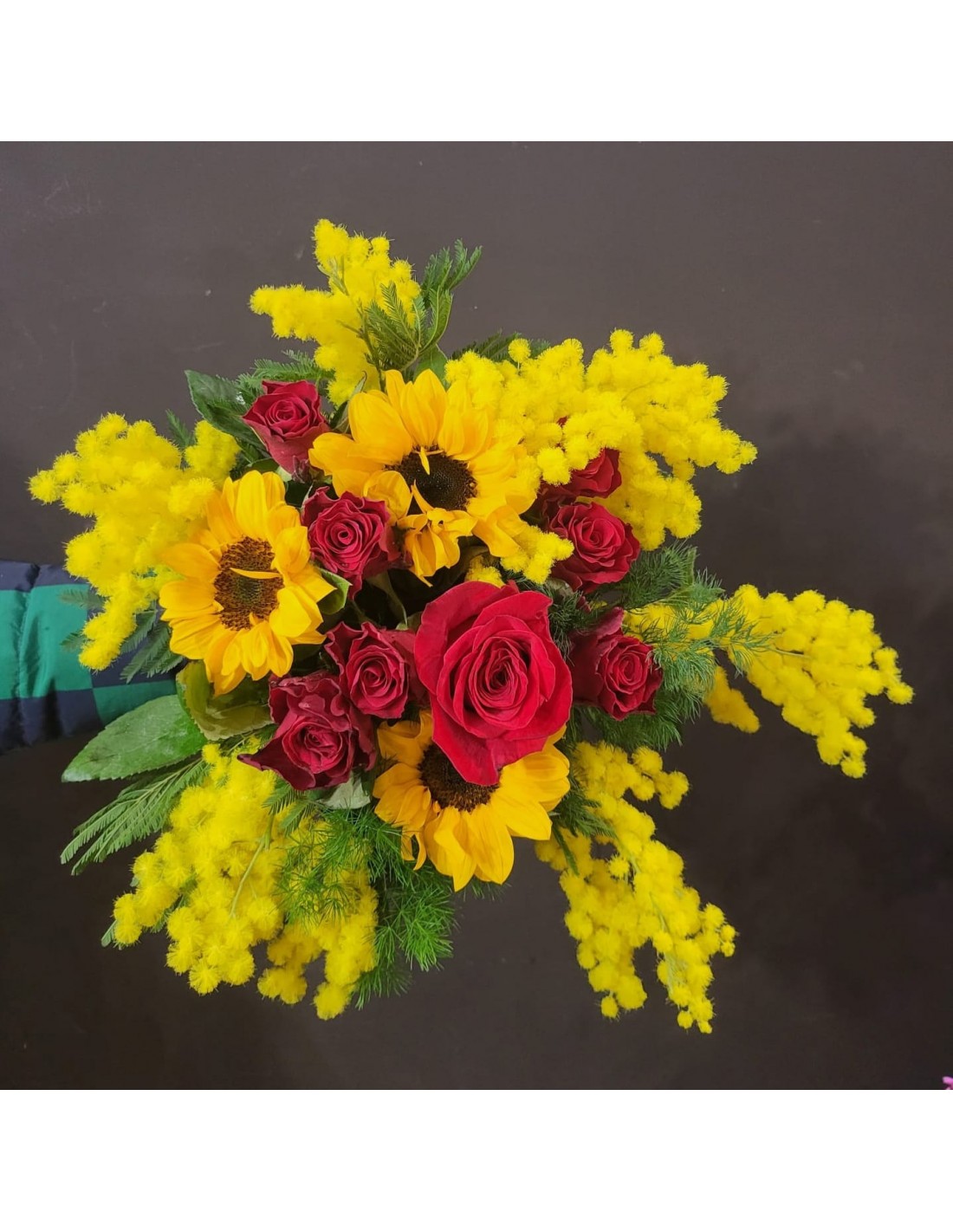 Bouquet primavera con girasolini e rose rosse più mimosa